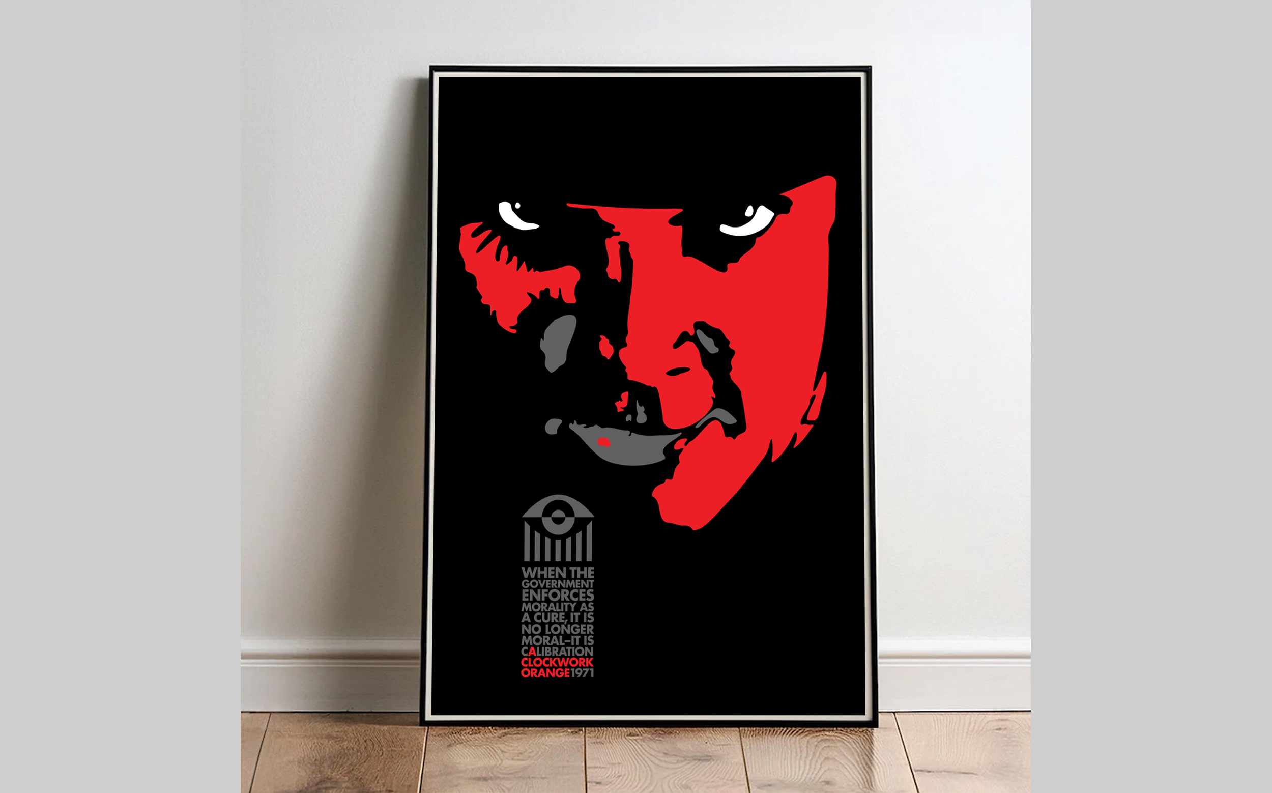 Individuality, free will, and the tension between personal choice and social control are, unfortunately, still relevant themes today. In our case, this is captured by the stylized expression of Alex’s intense gaze, paired with contrasting red, black, and white tones. The design draws inspiration from 1970s film poster art and incorporates geometric shapes into a timeless aesthetic. In addition to its cinematic roots, the poster resonates with today’s society by reflecting ongoing debates about surveillance, behavioral control, and the impact of social systems on personal freedom. Just as the film questions whether morality makes sense when imposed from the outside, the poster invites viewers to consider how modern social and political structures shape choice, identity, and autonomy, making the artwork not only a tribute to classic film but also a commentary with enduring relevance.